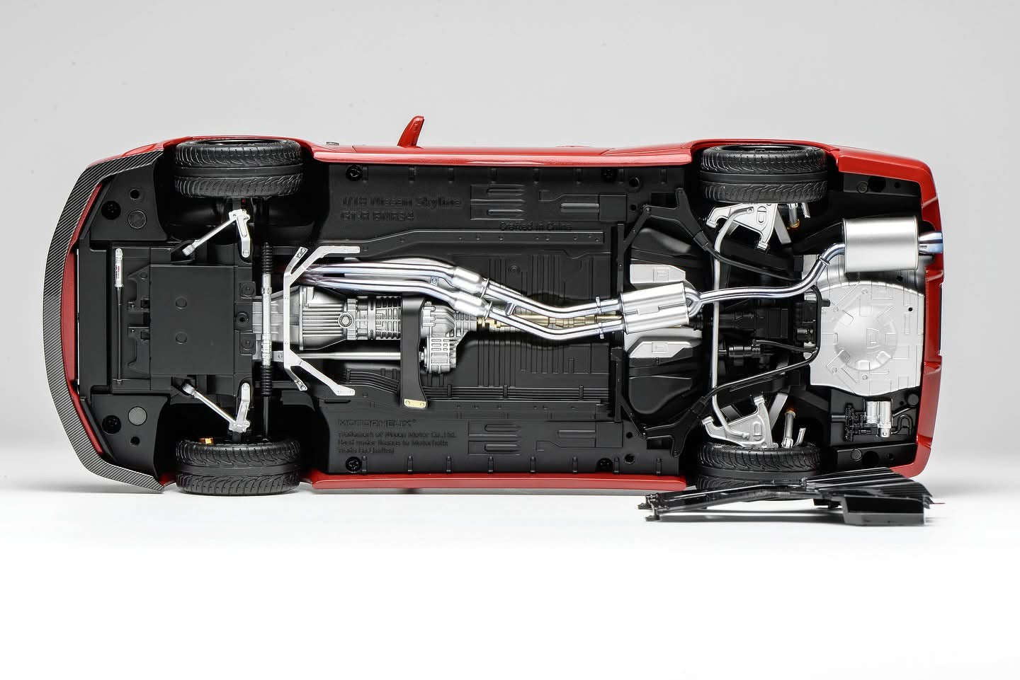 Openable doors/front-rear hoods, steering wheel linked to front wheels, 3D engine, detachable underbody panels / High-density foam + color box (with Nissan’s official laser label), special door opener, certificate, manual